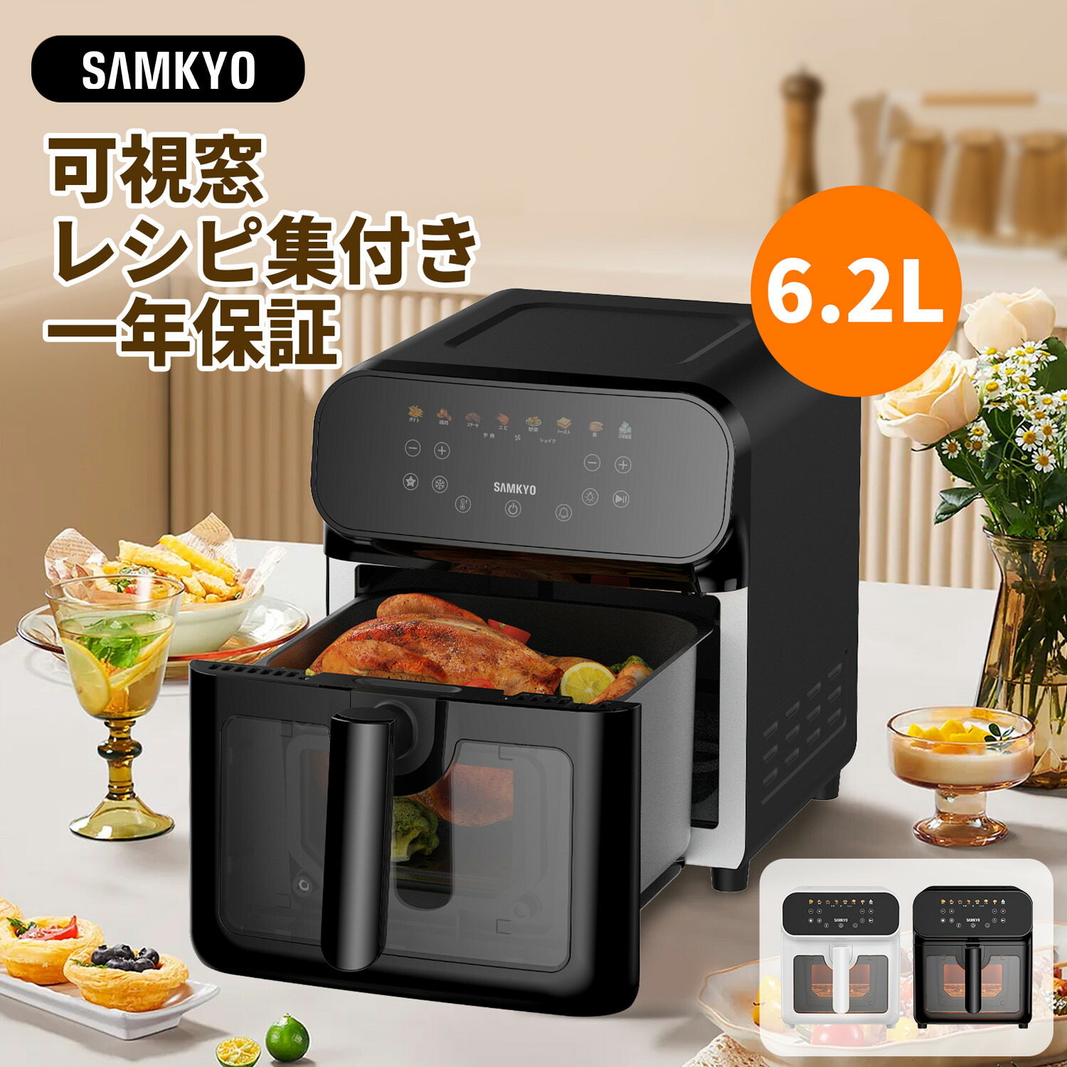 フライヤーというとポテトや空揚げなどの揚げ物のイメージがあるかもしれませんが、SAMKYO ノンフライヤーなら油いらずなのででポテト、鶏肉、ステーキ、エビ、野菜、トースト、魚、冷凍食品など、さまざまな美味しい料理をヘルシーに仕上げることができます。油を使用しないため、落ちにくい油汚れの心配もいりません。